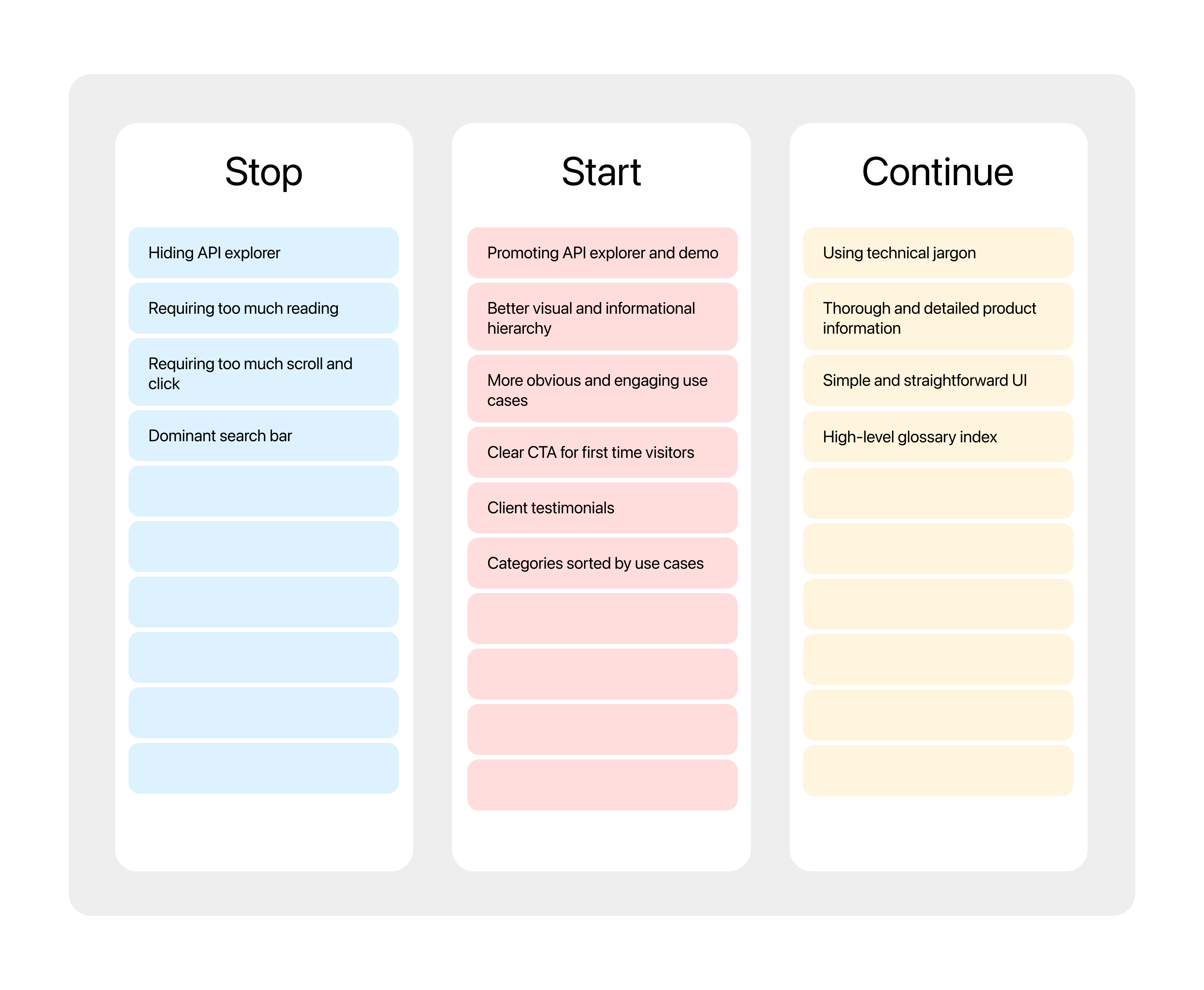 Step 1: Stop, Start and continue I chose this method as I was redesigning an existing platform rather than creating a new one, and there are existing users whose needs must be considered. This approach helped me organize and visualize the existing constraints and opportunities at the same time.